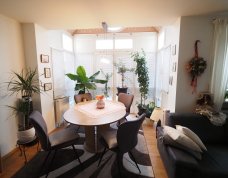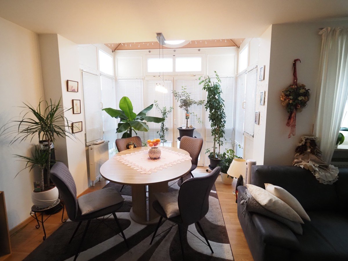 Helles Wohnzimmer mit charmantem Erker, ideal als Essplatz