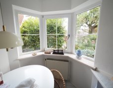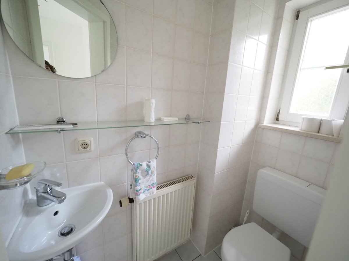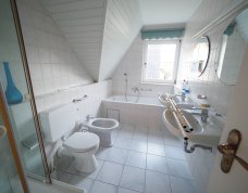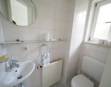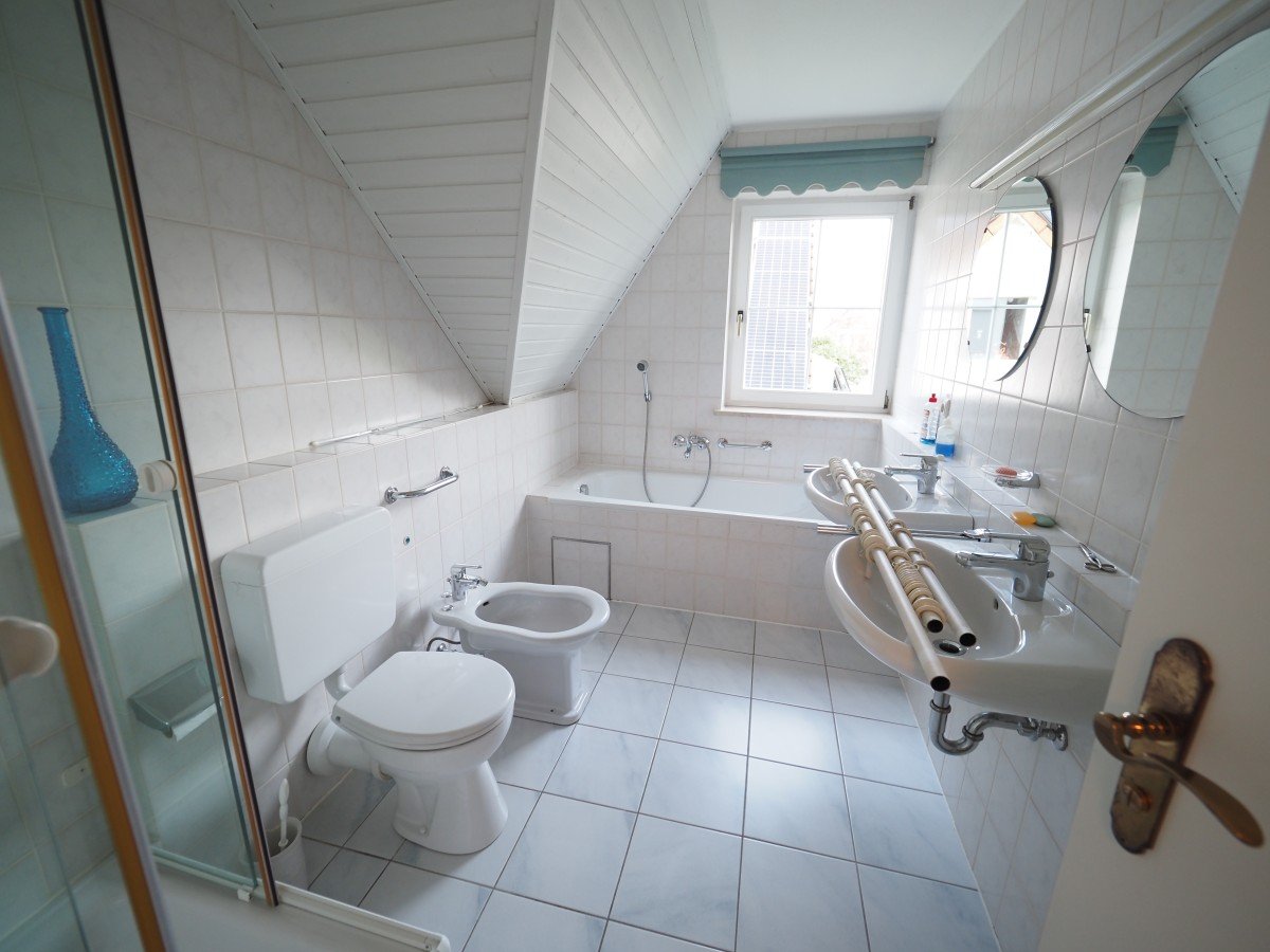 Helles Bad mit Badewanne, Dusche und Fenster. Gäste WC.