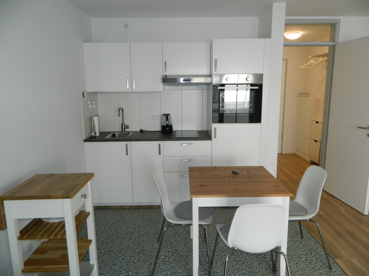 Einbauküche mit Induktionskochfeld, Backofen, Kühlgefrierschrank, komplett mit Geschirr und Küchenutensilien, Esstisch mit 2 Stühlen.