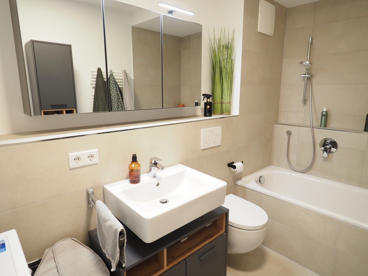 Modernes Bad mit Waschtisch, Badewanne, Handtuchheizkörper und Anschluss für Waschmaschine u. Trockner.