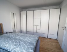 Das Schlafzimmer bietet ausreichend Platz für ein großes Bett und Stauraum. Das elegante Badezimmer ist modern gestaltet und verfügt über eine Badewanne sowie einen praktischen Waschmaschinenanschluss.