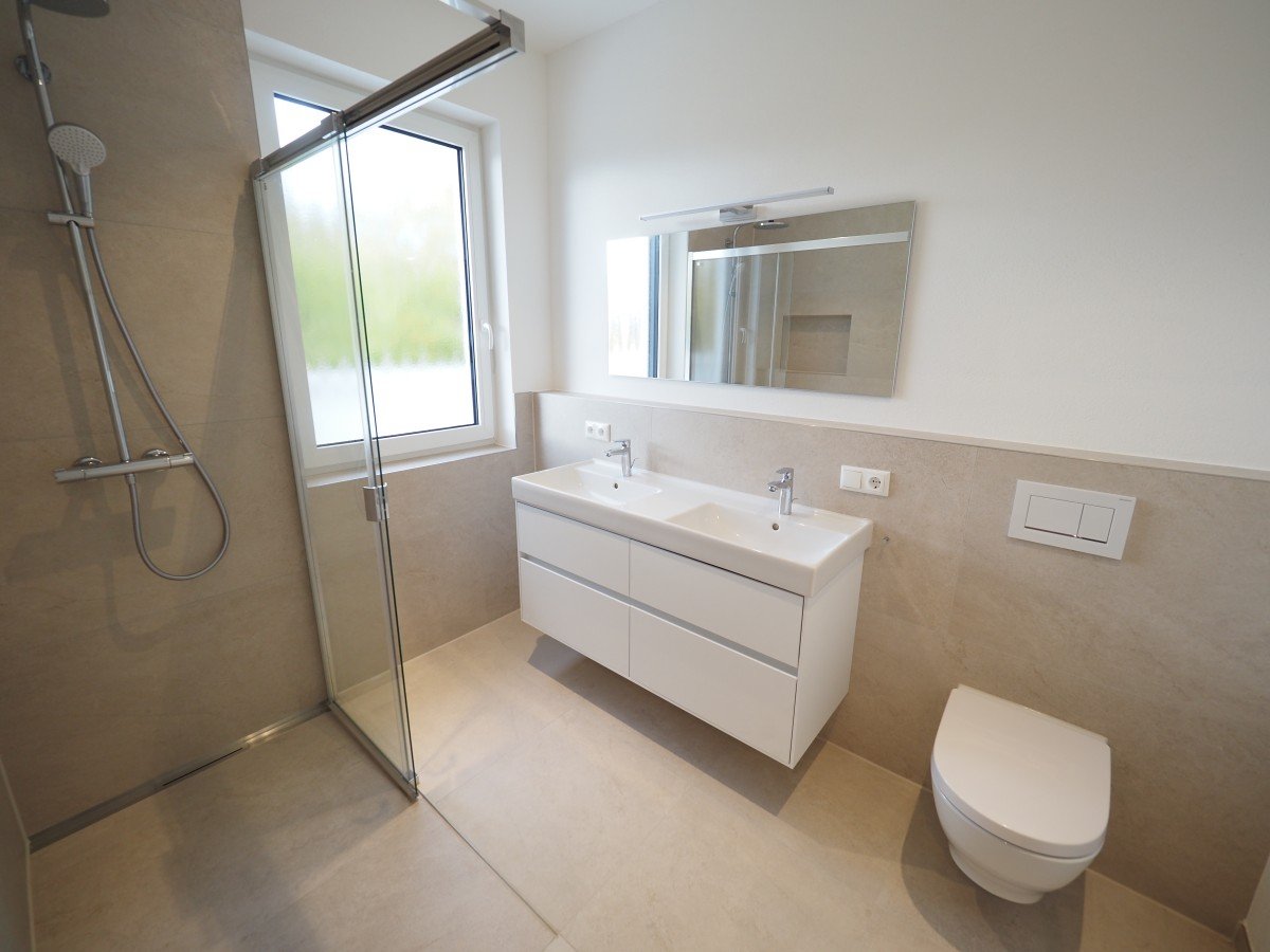 Modernes Bad mit ebenerdiger Dusche und Glasabtrennung