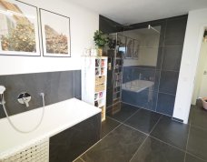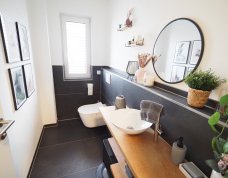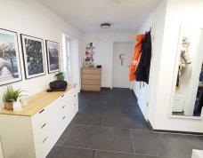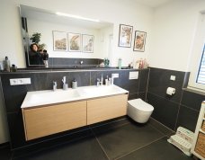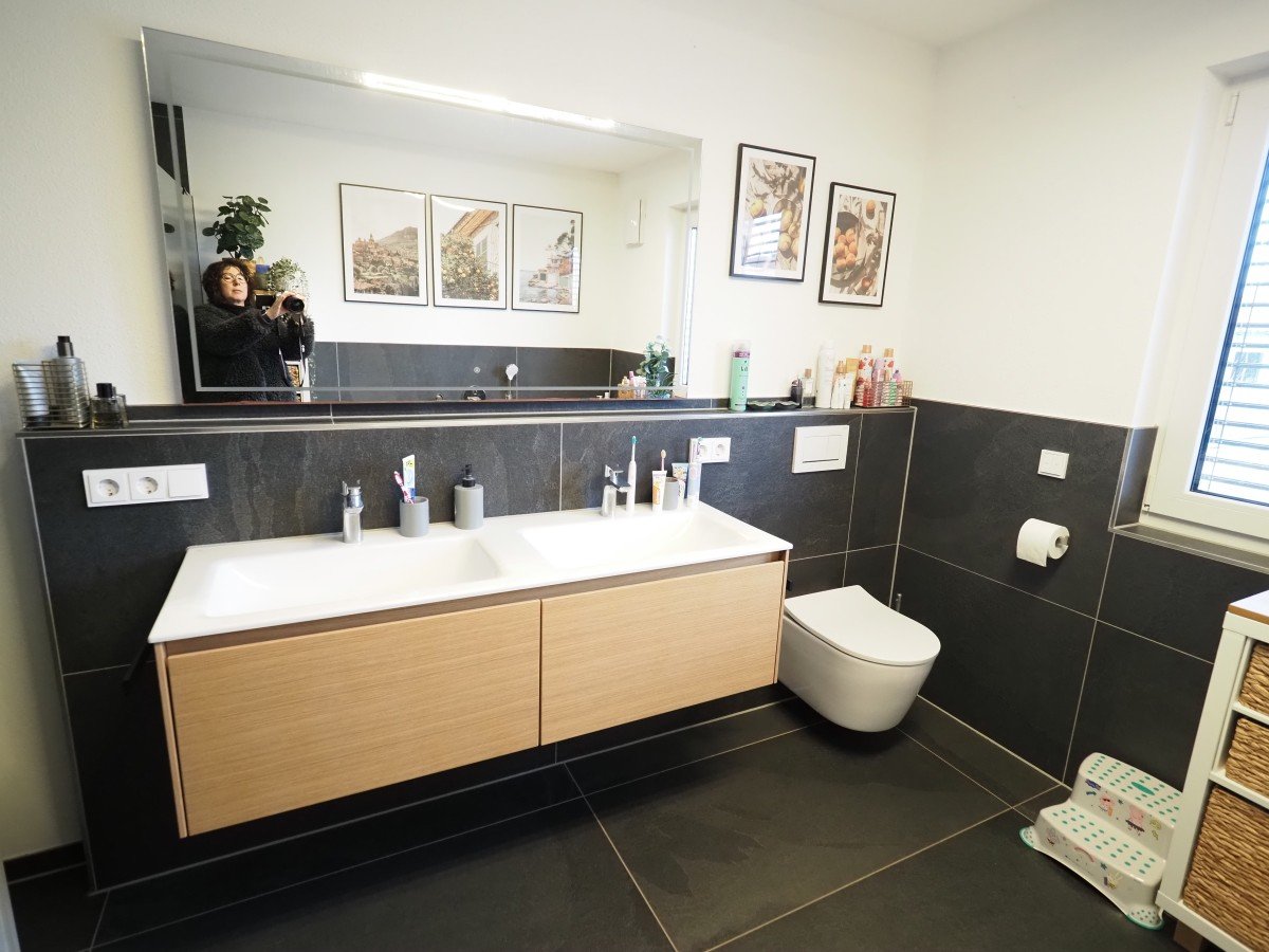 Edle großformatige Fliesen in Schieferoptik (Steinzeug) im Flur, Abstellraum und in den Bädern